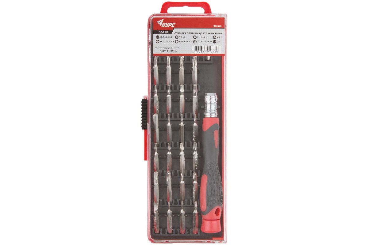 Отвертка с битами КУРС 56181 используется для выполнения точных работ. Например, ремонта часов, мелкой сборки и монтажа электрических приборов. За счет хром-ванадиевой стали биты устойчивы к высоким нагрузкам. Рифленая рукоять гарантирует крепкий захват во время работы. Также рукоять оснащена отверстием, чтобы повесить отвертку на видное место.
