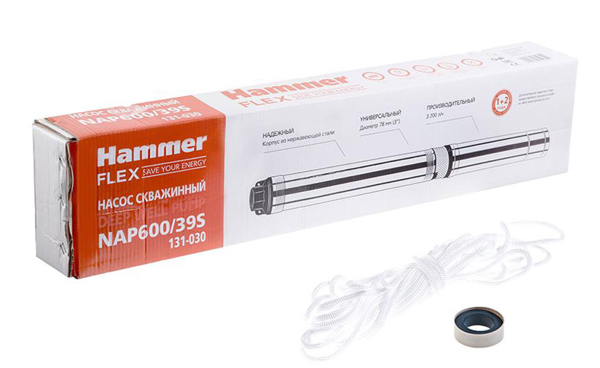 HAMMER NAP600/39S – погружной насос для подачи воды из скважины. С его помощью вы подведете воду к дому и организуете систему полива.
