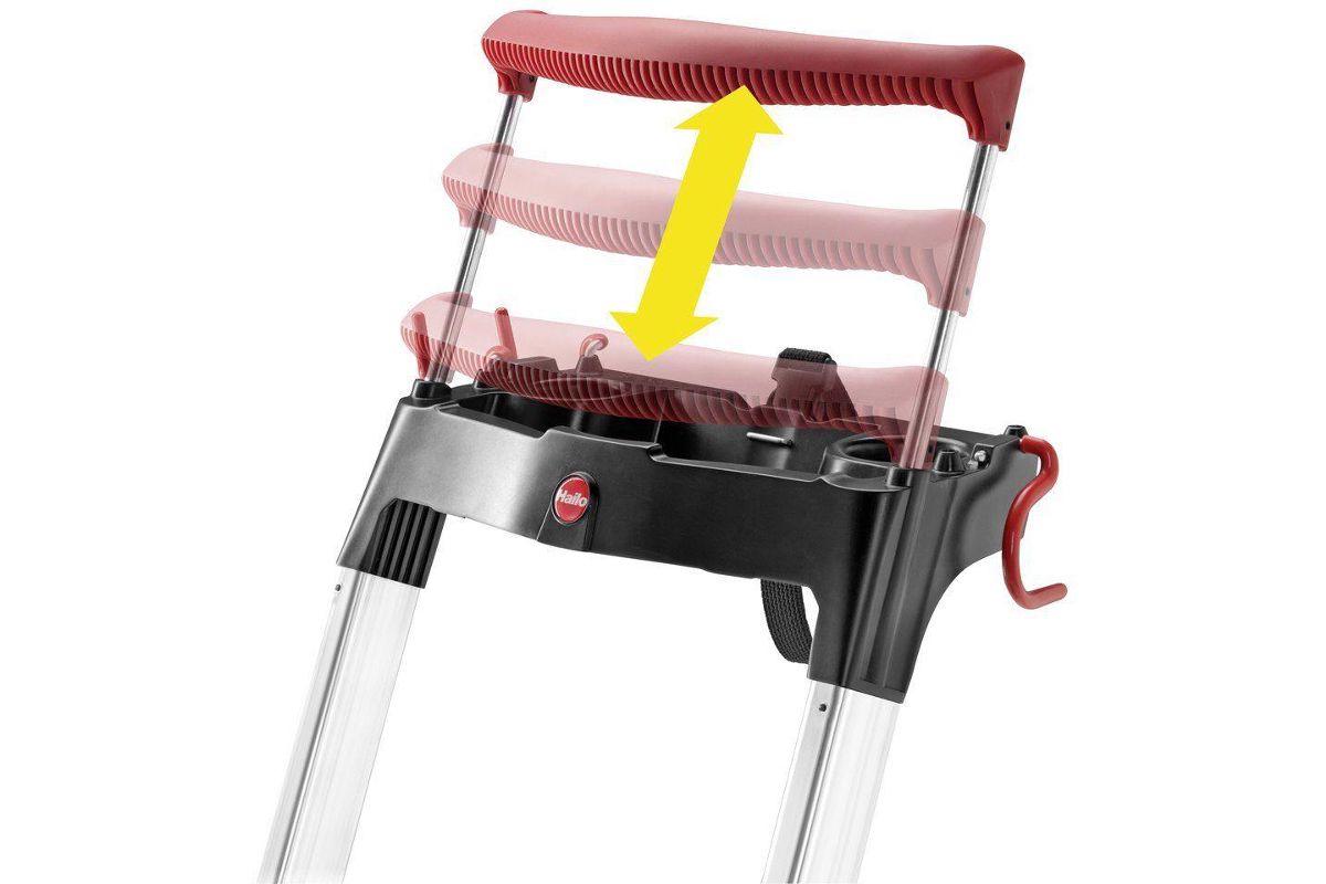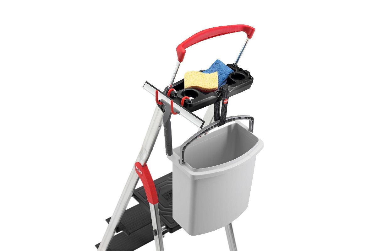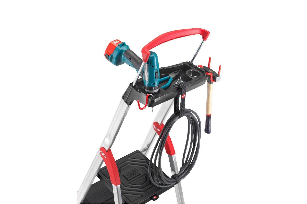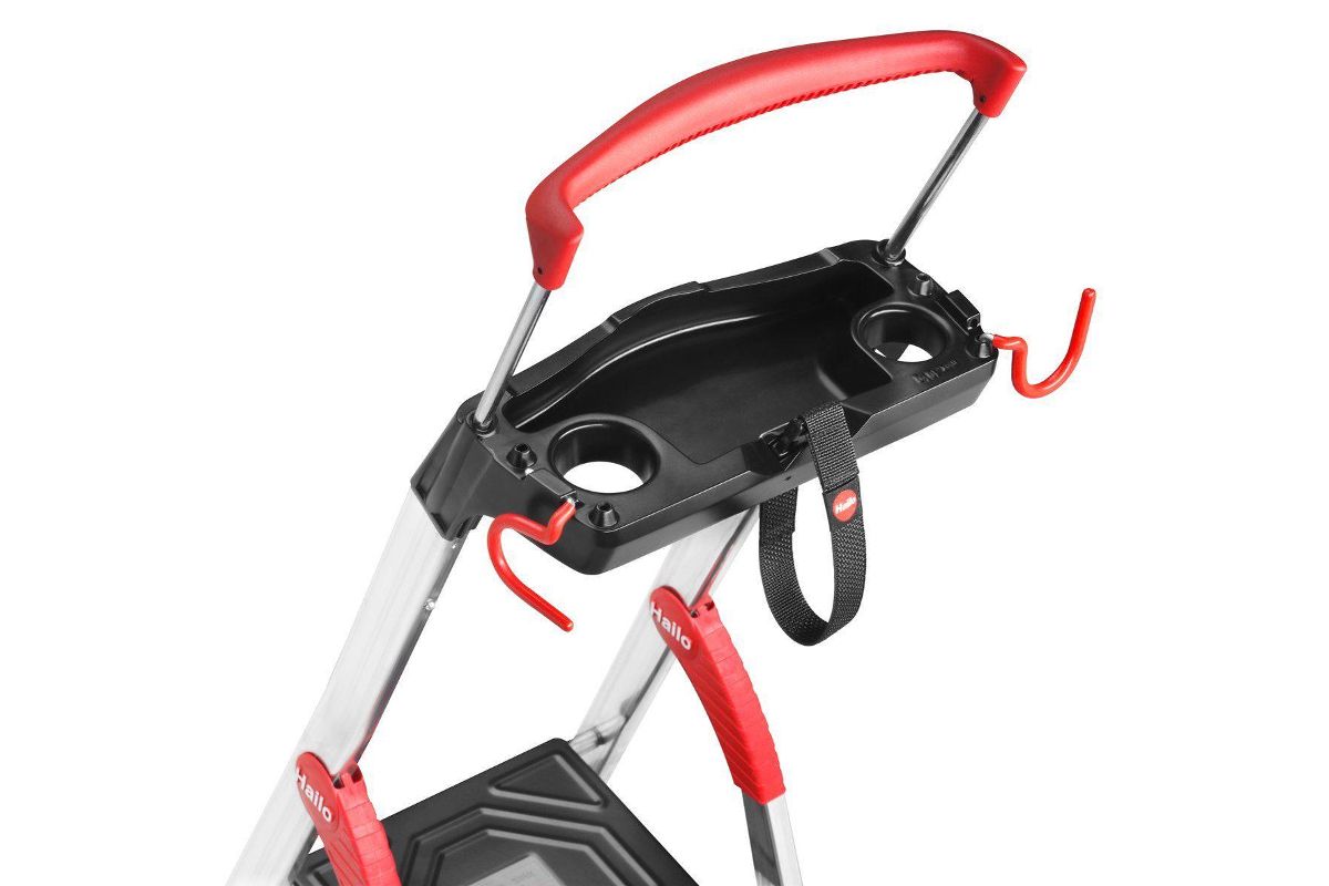 Алюминиевая стремянка выдвигающийся поручень безопасности, многофункциональный лоток для инстументов и мелких деталей + тканевый ремешок с замком для надежного крепления ведра или шнура электроудлинителя + 2 многофункциональных переставных крючка для крепления мелких инструментов.